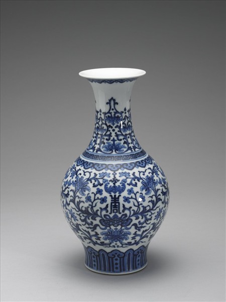 侈口寬辱,長頸,碩腹,矮圈足。薄胎白釉,頸上畫青花番蓮花,上下加飾回紋與如意雲各一道。腹部滿畫纏枝番蓮花,加飾蝙蝠、壽字及萬字、懸磬,上下加飾如意雲二道。底有青花書「大清乾隆年製」六篆字款。