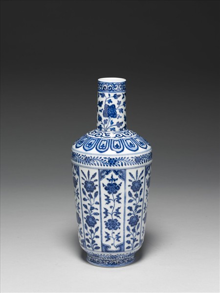 形似蒲棒,均斂口,短頸,寬肩,長腹,矮圈足。薄胎白釉,頸上及肩部畫青花花卉、蓮瓣與勾雲紋等四層,腹部劃分十格,各畫花卉一枝,上下加飾轉枝花一道。足畫轉枝花葉。底均有青花書「大清乾隆年製」六篆字款。