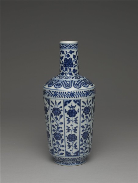 形似蒲棒,均斂口,短頸,寬肩,長腹,矮圈足。薄胎白釉,頸上及肩部畫青花花卉、蓮瓣與勾雲紋等四層,腹部劃分十格,各畫花卉一枝,上下加飾轉枝花一道。足畫轉枝花葉。底均有青花書「大清乾隆年製」六篆字款。