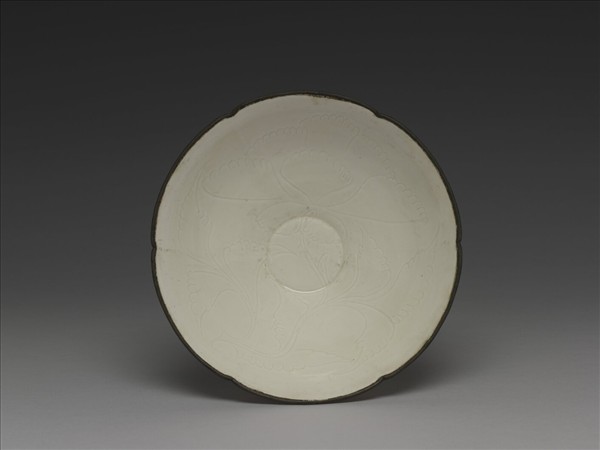 六花口大碗,與前件造形大致相似,斜壁微弧,圈足,惟足端滿釉,口緣鑲銅稜釦。碗口瓣曲淺而外壁於呼應花口低陷處豎劃陰線向內押入,使如花瓣相偕的花式碗。碗內,通壁與底以劃花呈現一折枝牡丹,單朵大花盛開於枝端,凌跨半個碗面;葉片於左右平衡伸展。全器紋飾以線狀刻線直刀雕刻,並以齒狀邊緣裝飾花葉;篦劃平行細線紋分刷飾於花瓣葉片上。院藏此類相似器多件,韓國開城遺址也出土此種特殊花葉裝飾的同型定窯碗與折腰碗,佈局也相類似。