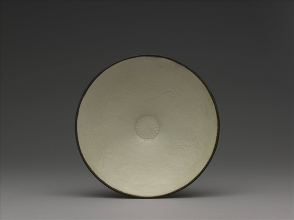 斗笠式碗,廣口、小圈足、陡斜壁,滿釉僅口鑲銅稜釦。器裡印花為飾,一對長尾飛禽展翅各據半個壁面,圖案式纏枝重瓣三角菊花紋花葉滿佈隙地,是豐饒吉祥圖樣。碗心印飾一組朵花菊瓣。此種樣式的斗笠碗在院藏品中數量不少,但故瓷8980與故瓷10535二件紋樣乃出自同一設計概念卻並不同模,院藏品中瓷2569與故瓷8980同模,而故瓷14501與故瓷10535 相似,且與江陰夏港宋墓所出略相近。然院藏此諸件釉色雖有優劣,釉面則均成霧狀,紋飾均未能清晰呈顯。