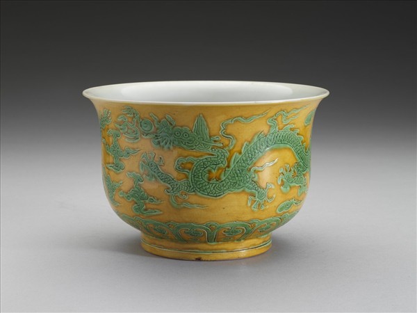 侈口寬唇,深壁,矮圈足。外壁錐拱雙雲龍戲珠,底邊飾如意雲紋。嬌黃釉,花紋加填綠彩,足飾綠線二道。內面純白,樸素無紋飾。底有青花書「正德年製」二行四字楷款,外加雙圈。