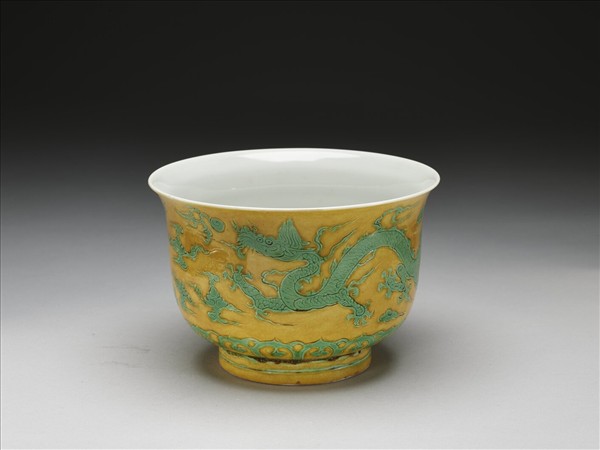 侈口寬唇,深壁,矮圈足。外壁錐拱雙雲龍戲珠,底邊飾如意雲紋。嬌黃釉,花紋加填綠彩,足飾綠線二道。內面純白,樸素無紋飾。底有青花書「正德年製」二行四字楷款,外加雙圈。