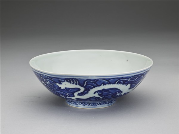 侈口,深壁,矮圈足。薄胎白釉,外壁淺劃雙龍戲珠,用青花鈎勒,面施白釉,隙地滿畫青波濤紋。足圈畫勾雲紋一周。口足分飾青線五道。碗內純白,樸素無紋飾。底有青花書「大明萬曆年製」六字二行楷款,外加雙圈。