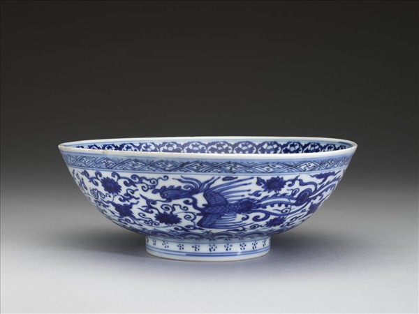 侈口,深壁,矮圈足。器內口沿下畫花卉圖案一道,周壁畫團鳳八隻,碗心畫鳳凰一對,加飾番蓮。器外口沿下畫萬字紋一道,周壁畫鳳凰一對,隙地畫纏枝番蓮花,底邊畫如意雲紋一周,足畫梅花點。內外花紋間加飾青線十六道。底有青花書「大明萬曆年製」六字二行楷款,外加雙圈。