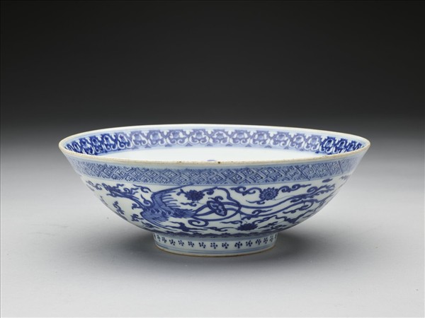 侈口,深壁,矮圈足。器內口沿下畫花卉圖案一道,周壁畫團鳳八隻,碗心畫鳳凰一對,加飾番蓮。器外口沿下畫萬字紋一道,周壁畫鳳凰一對,隙地畫纏枝番蓮花,底邊畫如意雲紋一周,足畫梅花點。內外花紋間加飾青線十六道。底有青花書「大明萬曆年製」六字二行楷款,外加雙圈。