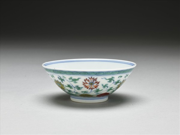侈口,深壁,矮圈足。內壁純白無紋飾,碗心畫纏枝番蓮一朵。外口沿下畫回紋一周,外壁畫纏枝番蓮六朵,底邊畫如意紋一周。內外口足間分飾青線七道。底有青花書「大清雍正年製」二行六字楷款,外加雙圈。