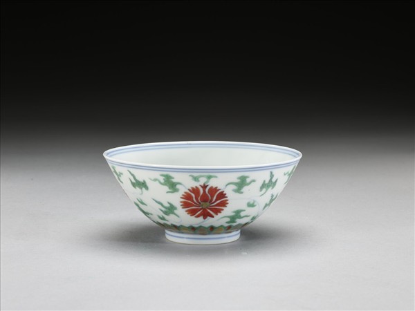 敞口,深壁,矮圈足。內壁純白無紋飾,碗心畫纏枝番蓮一朵。外壁畫纏枝番蓮四朵,底邊畫蓮瓣紋一周。內外口足間分飾青線七道。底有青花書「大清雍正年製」二行六字楷款,外加雙圈。