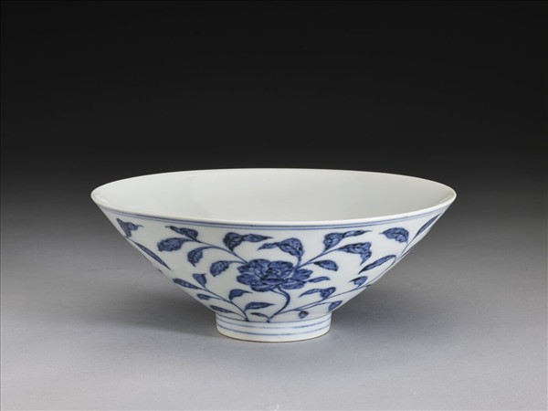 侈口窄唇,深壁,矮圈足。薄胎白釉,外壁畫纏枝月季花四朵,口足分飾青線五道。內面純白,樸素無紋飾。