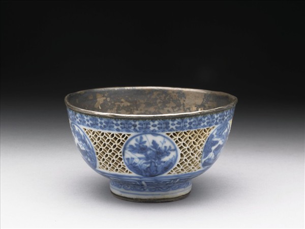 碗,侈口,圓弧腹,圈足。碗內為金屬壁,口沿、足沿亦以金屬包覆。外壁有六開光,開光內青花繪花鳥圖,間隙鏤雕錢紋,腹近足部有變形蓮瓣紋。底外有青花書「大明萬曆年製」六字楷款,外加雙方圈。
