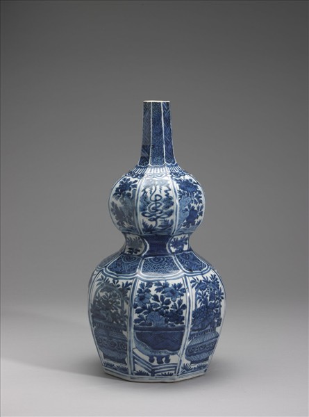 葫蘆瓶,器身分為八稜八瓣,小直口、短頸、束腰、圓腹上小下大、平底、矮圈足。胎骨厚重,表面以青花彩繪紋飾,通體施白釉,釉色微帶灰,外底無釉露胎。器外壁頸部及腰部下段繪蓮瓣紋結合如意雲,四瓣內填卍字錦地、四瓣填編織紋,彼此交錯;腰部上段有四橢圓形開光,內填花卉,間隙滿繪卍字錦地。上腹部於各瓣內飾牡丹、菊等花卉,每隔一瓣加書吉祥文字,共見「福」與「壽」各二字、兩兩相對;下腹部交錯繪花籃、花盆各四只,分別栽植四季花卉。