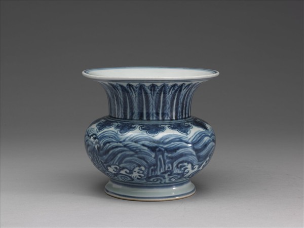 渣斗,侈口、寬直頸、扁碩腹,底作三階式,矮圈足外撇。胎骨厚重,表面以青花彩繪紋飾,通體施白釉,足緣無釉露胎;青花濃艷,色深處多褐黃結晶疵斑。器內外口沿均繞雙弦紋一周,外壁頸部飾蕉葉紋,主葉脈留白、兩旁側脈細細描繪並塗染青花彩;頸肩交界處繞弦紋數道,下接如意雲紋一周;腹部滿繪波濤紋,其間點綴山石,近底處加卷渦紋;外足圈以弦紋為飾,並染上一層淡淡青色。底心有青花書「大明宣德年製」六字雙圈雙行楷書款。波濤蕉葉紋為宣德窯渣斗上常見的紋飾之一。