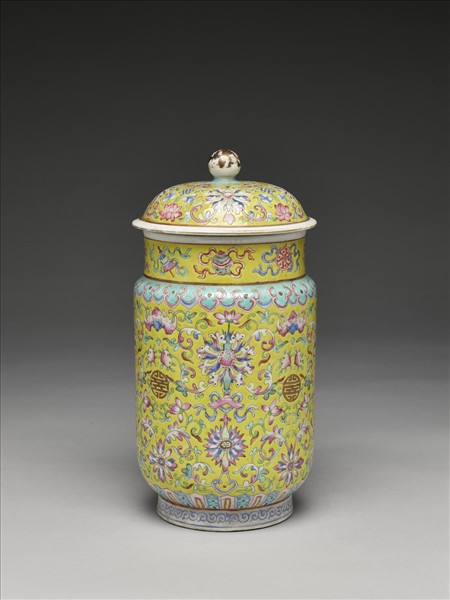 粉彩黃地福壽紋蓋罐