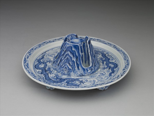 青花爵杯搭配山形托盤首見於明代永樂時期。爵杯仿青銅爵器形,前有橢圓流,後帶尖形尾,左右有雙柱立於口沿,器腹下承三足。托盤折沿、平底,底有四如意形足,盤中央突起一座三山形支柱,三山之間略凹並有三孔隙,供瓷爵的腹部及三足歇放,所以也稱「歇爵山盤」。瓷爵外壁兩側各畫一條五爪雲龍,其下畫海水江崖紋,三足各飾如意雲紋及雙線,器底有澀胎一圈,中央施釉並畫蓮花一朵,器內純白無紋飾。盤中心除了三山形凸起外,四周繪飾雙龍紋以及海水波濤紋,口唇上畫勾雲卷草紋,盤外畫折枝番蓮花二層,四足各有如意雲及番蓮一朵,盤底中心露出緻密潔白胎體。相同的爵杯和托盤組合在景德鎮負責燒造宮廷用器的珠山遺址曾有出土。瓷爵的燒製始於元代。洪武元年(1368),明太祖朱元璋在談論太廟祭器時,說:「共設酒尊三、金爵八、瓷爵十六於殿東西」,可以看出瓷爵在明初已是重要祭器。明英宗時,禮部尚書蔣守約也曾提到「大祀天地、社稷,舊制皆用瓷爵」,可以推想帶有五爪雲龍紋和海水江崖紋組合的瓷爵和爵盤,應該是永樂時期重要的家國重器。
