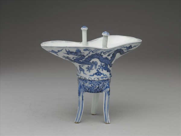 青花爵杯搭配山形托盤首見於明代永樂時期。爵杯仿青銅爵器形,前有橢圓流,後帶尖形尾,左右有雙柱立於口沿,器腹下承三足。托盤折沿、平底,底有四如意形足,盤中央突起一座三山形支柱,三山之間略凹並有三孔隙,供瓷爵的腹部及三足歇放,所以也稱「歇爵山盤」。瓷爵外壁兩側各畫一條五爪雲龍,其下畫海水江崖紋,三足各飾如意雲紋及雙線,器底有澀胎一圈,中央施釉並畫蓮花一朵,器內純白無紋飾。盤中心除了三山形凸起外,四週繪飾雙龍紋以及海水波濤紋,口唇上畫勾雲卷草紋,盤外畫折枝番蓮花二層,四足各有如意雲及番蓮一朵,盤底中心露出緻密潔白胎體。相同的爵杯和托盤組合在景德鎮負責燒造宮廷用器的珠山遺址曾有出土。瓷爵的燒製始於元代。洪武元年,明太祖朱元璋在談論太廟祭器時,說:「共設酒尊三、金爵八、瓷爵十六於殿東西」,可以看出瓷爵在明初已是重要祭器。明英宗時,禮部尚書蔣守約也曾提到「大祀天地、社稷,舊制皆用瓷爵」,可以推想帶有五爪雲龍紋和海水江崖紋組合的瓷爵和爵盤,應該是永樂時期重要的家國重器。