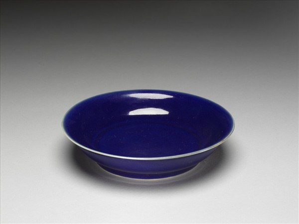 侈口窄唇,淺弧形壁,矮圈足。全器施霽青釉,施釉至足邊,口沿與足邊各留一道白邊,足緣無釉露白胎。足內壁及底施白釉,底有青花書「大明宣德年製」六字二行楷款,外加雙圈。