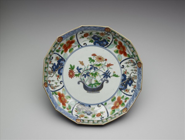 盤口部外敞,壁呈淺圓弧,圈足低矮。盤心繪一菱角形提籃及各色花卉之盆花紋,內壁有四開光,開光內繪湖石花木紋樣,開光外則飾折枝茶花。近口沿處一圈則以六朵紅金彩小花為界,穿插飾以青花菱格菊花紋及綠地渦卷花紋各三。器外壁有六朵紅花枝五彩纏枝花卉紋,口沿則飾波濤紋。足內以青花書「大明萬曆年製」楷書雙圈款,並有四個明顯支釘痕跡。