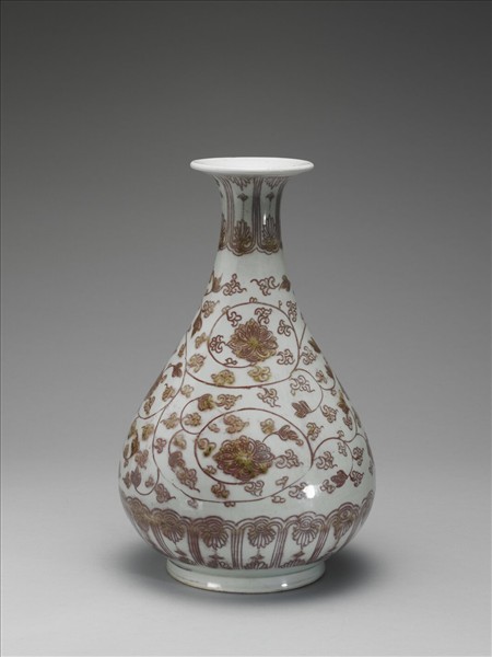 瓶,侈口寬唇,短頸,溜肩,碩腹,矮圈足,通稱玉壺春。胎骨厚重,繪釉裡紅紋飾,呈磚紅色,帶綠色苔點;腹部畫滿纏枝花卉紋,頸部及底邊各畫蓮瓣加花圖案一周。除足底端無釉,露白色胎,餘罩透明釉。