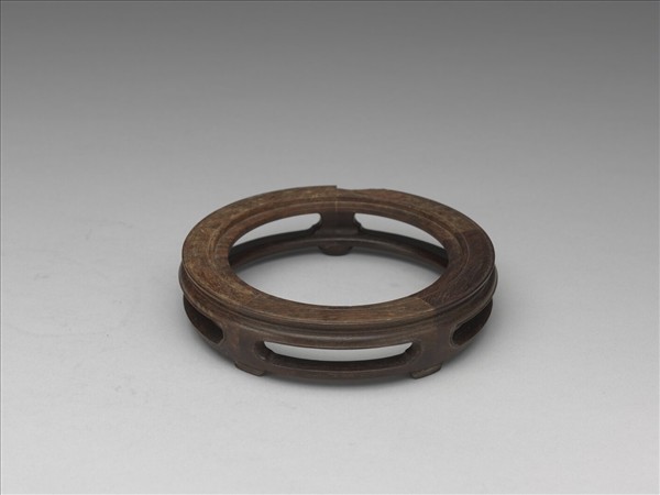 圓形木座,座面為環形,以固定瓷碟,五足,足間有海棠形鏤空。座面背部有陰刻填金「古稀天子御玩」、「甲」及「宋定窑蟠龍碟」楷款。此件為故瓷9306附件。