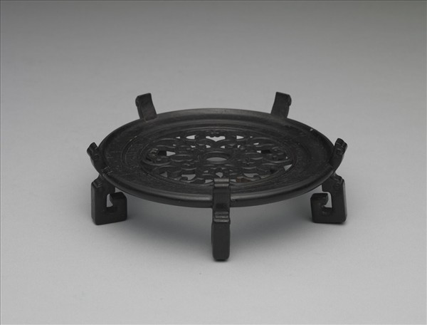 圓形木座,座面雕鏤空五瓣花裝飾,五足,上端突出座面,以固定瓷洗,下端呈U字形。座面背部有陰刻填金「古稀天子御玩」、「乙」及「宋定窑蟠龍洗」楷款。此件為故瓷9307附件。
