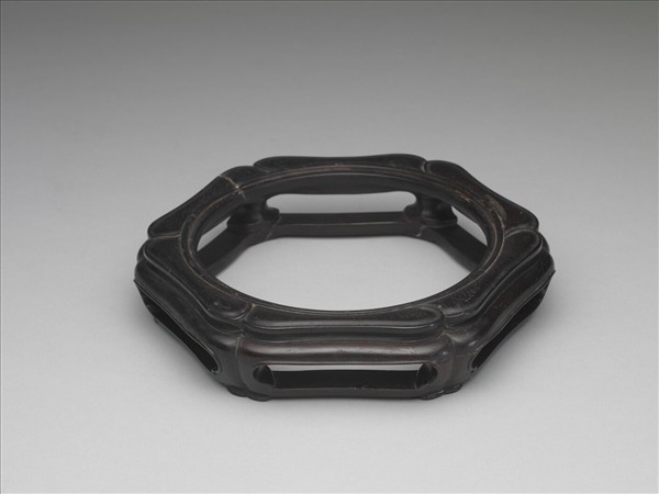 六邊形木座,座面為環形,以固定瓷碟,周圍做葵花瓣裝飾,五足,足間有海棠形鏤空。背面有陰刻填金「古稀天子御玩」、「乙」及「宋定窑舞鳳盤」楷款。此件為故瓷9310附件。