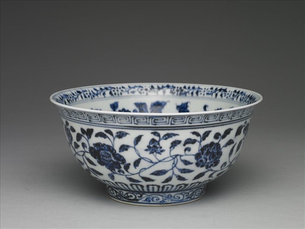 侈口窄唇,深壁,矮圈足。碗內口唇上畫轉枝菊花一周,內壁畫纏枝四季花五朵,碗心畫番蓮一枝。外面口沿下畫回紋一道,周壁畫纏枝四季花五朵,底邊畫蓮瓣紋,足圈畫卷草紋。內外花紋間加飾青線十一道。