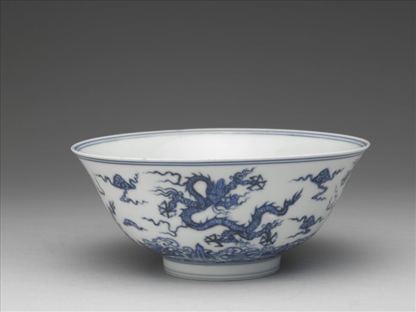 侈口窄唇,深壁,矮圈足。薄胎白釉。碗心青花雙圈內畫雲龍一條,外加雙圈,外壁畫雲龍四條,隙地飾以三出雲紋及朵雲紋,底邊畫波濤、山石一周;內壁純白,樸素無紋飾;口沿內外及足圈上下各畫青線兩道。底有青花書「大明成化年製」二行六字楷款,外加雙圈。