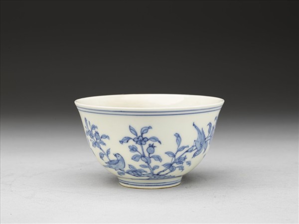 侈口,深壁,圈足。杯外壁青花繪石榴樹及雀鳥紋,三隻棲於樹間,一隻飛翔鳴叫,相互呼應。杯內素白無紋。口足各飾青花弦紋二道。底青花書「大明成化年製」雙圈六字楷款。