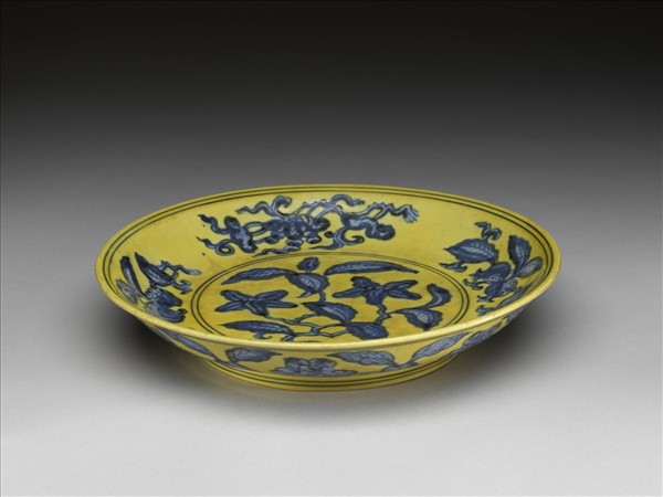 侈口窄唇,淺壁,矮圈足。內壁畫青花石榴、葡萄等四種果實,盤心畫玉蘭一枝。外壁畫轉枝牡丹花八朵。內外分畫青線十道。原為白地青花,加施黃釉一層。底有青花書「大明正德年製」二行六字楷款,外加雙圈。