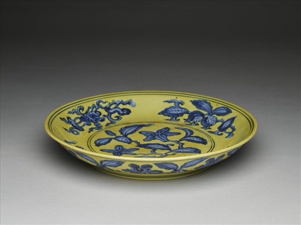 侈口窄唇,淺壁,矮圈足。內壁畫青花石榴、葡萄等四種果實,盤心畫玉蘭一枝。外壁畫轉枝牡丹花八朵。內外分畫青線十道。原為白地青花,加施黃釉一層。底有青花書「大明正德年製」二行六字楷款,外加雙圈。