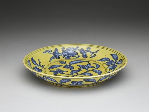 侈口窄唇,淺壁,矮圈足。內壁畫青花石榴、葡萄等四種果實,盤心畫玉蘭一枝。外壁畫轉枝牡丹花八朵。內外分畫青線十道。原為白地青花,加施黃釉一層。底有青花書「大明正德年製」二行六字楷款,外加雙圈。