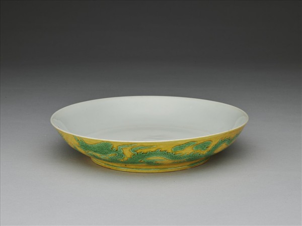侈口,淺壁,矮圈足。外壁刻畫雙龍戲珠紋,足刻淺線一道。嬌黃釉,花紋加填綠彩。內面純白,樸素無紋飾。底有青花書「正德年製」二行四字楷款,外加雙圈。