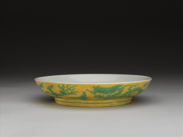 侈口,淺壁,矮圈足。外壁刻畫雙龍戲珠紋,足刻淺線一道。嬌黃釉,花紋加填綠彩。內面純白,樸素無紋飾。底有青花書「正德年製」二行四字楷款,外加雙圈。