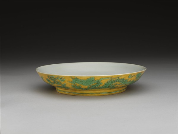 侈口,淺壁,矮圈足。外壁刻畫雙龍戲珠紋,足刻淺線一道。嬌黃釉,花紋加填綠彩。內面純白,樸素無紋飾。底有青花書「正德年製」二行四字楷款,外加雙圈。
