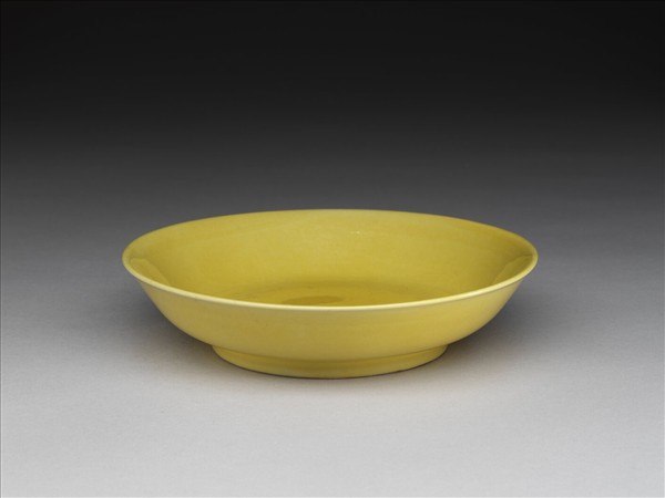 侈口,淺壁弧形,矮圈足。胎質較薄,器內外壁滿施嬌黃釉,盤底純白,樸素無紋飾。底有青花書「大明正德年製」二行六字楷款,外加雙圈。