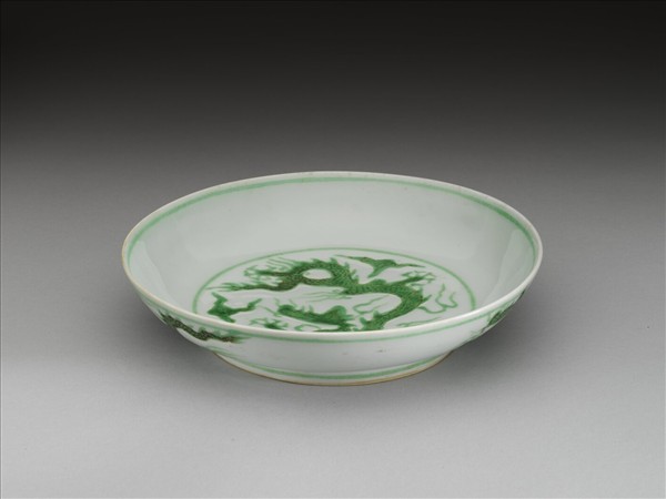侈口,淺壁弧形,矮圈足。盤心與外壁刻畫雲龍三條,外壁隙地淺劃雙珠、波濤紋。薄胎白釉,龍紋加填綠彩,口足內外分畫綠線四道。底有青花書「大明正德年製」二行六字楷款,外加雙圈。