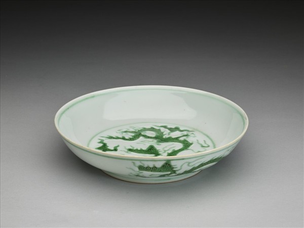 侈口,淺壁弧形,矮圈足。盤心與外壁刻畫雲龍三條,外壁隙地淺劃雙珠、波濤紋。薄胎白釉,龍紋加填綠彩,口足內外分畫綠線四道。底有青花書「大明正德年製」二行六字楷款,外加雙圈。