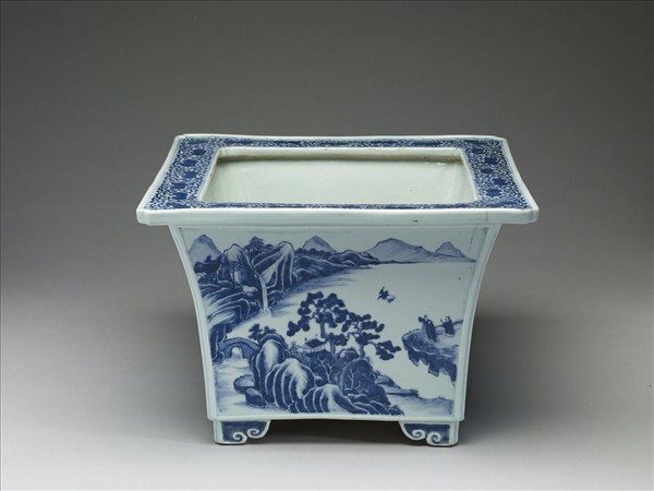 盆,方口折沿,四角內委,深壁微下斂,四如意雲形足。折沿上繪桃葉桃實,四面以山水人物景致為飾,層巒疊嶂,富層次感,青花鮮麗明爽。胎骨厚重,器內及底露胎,外底有火石紅,設二圓形滲水孔,折沿下方青花橫書「大清康熙年製」楷款一行。康熙時期的瓷花盆多為青花及五彩大型器皿,之後的雍正、乾隆兩朝似乎少見燒製,原因或與瓷花盆可延續使用的特性有關。清乾隆六年(1741)丁觀鵬等人畫〈十八學士圖卷〉(故畫01555),畫中黑地金彩的漆方几上置有四方型、雲頭足的青花花盆,形似本展件。盆內根莖蒼老,顯露悠悠歲月,由此跡象或可推測,老盆栽植於康熙時期,並沿用至乾隆朝。