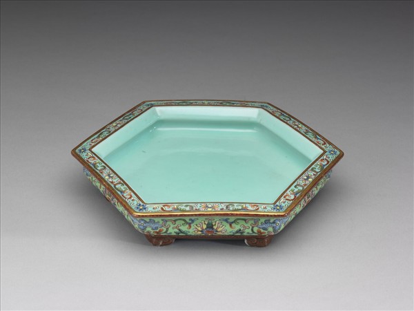 六方形,侈口窄唇,平底,六如意雲足。胎骨厚重,外面淺綠釉地,彩畫番蓮花,加飾蝙蝠,足部及口沿均硃紅地,描金勾雲、墨點。器內翠綠釉,樸素無紋飾。