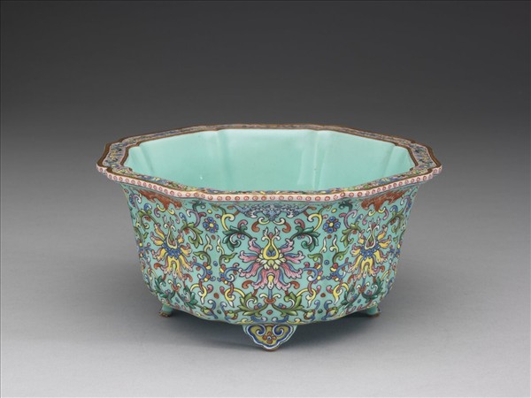 八辦牡丹花形,侈口窄唇,平底,六如意雲足。胎骨厚重,外面湖綠釉地,彩畫番蓮花,加飾蝙蝠,足部及口沿均硃紅地,描金勾雲、墨點。器內湖綠釉,樸素無紋飾。