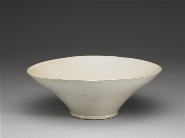 侈口五瓣,深壁上豐下削,平底,矮圈足。胎骨甚薄,樸素無紋。外壁白釉較潤,器內灰黯,多磨擦痕跡,足底露灰白色胎。