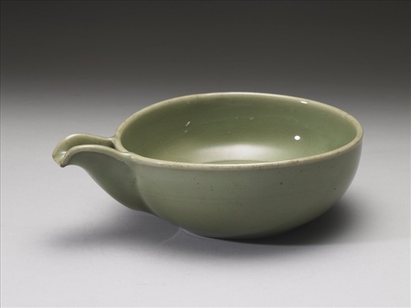 匜式盂,器身作斂口淺碗,圓唇,底內挖為足,足裡刮出環形無釉墊燒區。一側橫出方流,流口圓弧斜出,高於盂口,流緣亦具圓唇稜。器裡底部以弦紋為界,淺挖寬平。韓國新安元代沈船(1323年)中有相近物。