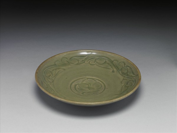 敞口盤,弧形淺壁,口緣微斂,盤心微凹下;矮圈足,足內壁斜挖,底面略隆起。全器施以偏黃調的橄欖青釉,足以內外施釉不勻,足緣露胎處色深。外壁口下一道弦紋;器內壁寬帶紋一周,為劃花轉枝葉紋,葉莖蟠轉若菱形;盤心一折枝葉。斜刀劃花並帶篾紋。