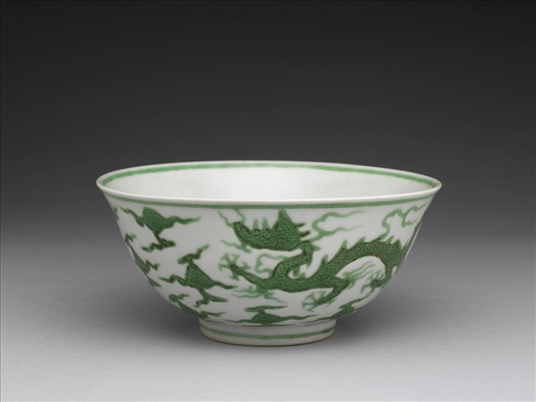 碗,侈口,口外撇,圈足。胎略薄。碗心與外壁刻劃雲龍及雙龍戲珠紋,外壁隙地有靈枝紋。由於龍紋刻線較深,綠彩釉積深因而成重色,內外加飾綠線四道。底有青花書「大明弘治年製」雙圈六字楷款。