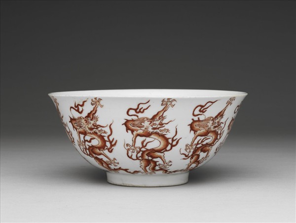 均侈口窄唇,深壁,矮圈足。薄胎白釉,外壁描紅畫龍紋九條,作立舞狀。碗內純白釉,樸素無紋飾。底均有青花書「大明弘治年製」六楷字款,外加雙圈。