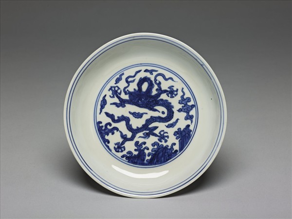 撇口盤,弧壁,圈足微斂。盤心繪山石波濤間的雲龍紋,龍帶雙角五爪,姿態僵硬;外壁繪山石波濤與裝飾性雲紋,並等距置四環形開光,內各書「永」、「保」、「萬」、「年」,整器青花層次弱,青料至此時期始或有溢出輪廓之外;器底中央書「大明嘉靖年製」兩行六字無框楷書款。以開光分隔字,且每一開光只置一字的裝飾形態,是宋代磁州窯大為流行的樣式;正德阿拉伯文裝飾有相同意象,至嘉靖、萬曆朝則經常見於官窯作品。這種盤面以開光分置吉祥漢字的裝飾手法,深刻地影響了明末清初的漳州窯外銷瓷。