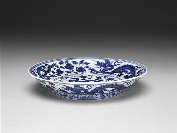撇口,淺弧壁,矮圈足。盤心畫一立龍,昂首闊步,穿行纏枝蓮中,盤內、外壁則各畫雙龍戲走於纏枝牡丹花葉中,足圈畫回紋一周。胎骨稍厚,青花濃艷,多處帶褐綠疵斑,釉內密佈大小晶亮氣泡。圈足露胎,質堅細膩,胎釉一線泛淺橘紅色。底青花書「大明宣德年製」二行六字楷款,外加雙圈。
