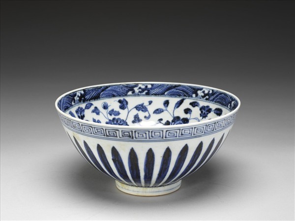 敞口,深壁上豐下斂,尖底,矮圈足,通稱「蓮子碗」。內口沿下畫波濤紋一周,加飾青線三道,周壁畫纏枝牡丹、菊花各三朵,碗心畫枇杷一枝,邊飾雙線。外口沿下畫回紋一周,加飾青線三道,周壁畫菊瓣紋,足飾青線二道。