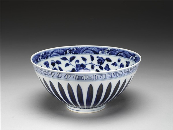 敞口,深壁上豐下斂,尖底,矮圈足,通稱「蓮子碗」。內口沿下畫波濤紋一周,加飾青線三道,周壁畫纏枝牡丹、菊花各三朵,碗心畫枇杷一枝,邊飾雙線。外口沿下畫回紋一周,加飾青線三道,周壁畫菊瓣紋,足飾青線二道。