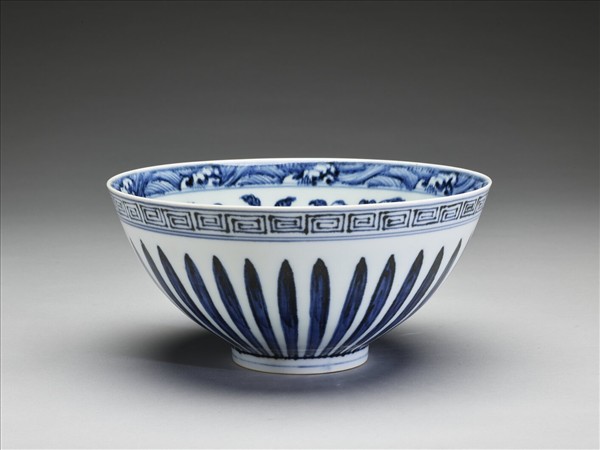 敞口,深壁上豐下斂,尖底,矮圈足,通稱「蓮子碗」。內口沿下畫波濤紋一周,加飾青線三道,周壁畫纏枝牡丹、菊花各三朵,碗心畫枇杷一枝,邊飾雙線。外口沿下畫回紋一周,加飾青線三道,周壁畫菊瓣紋,足飾青線二道。